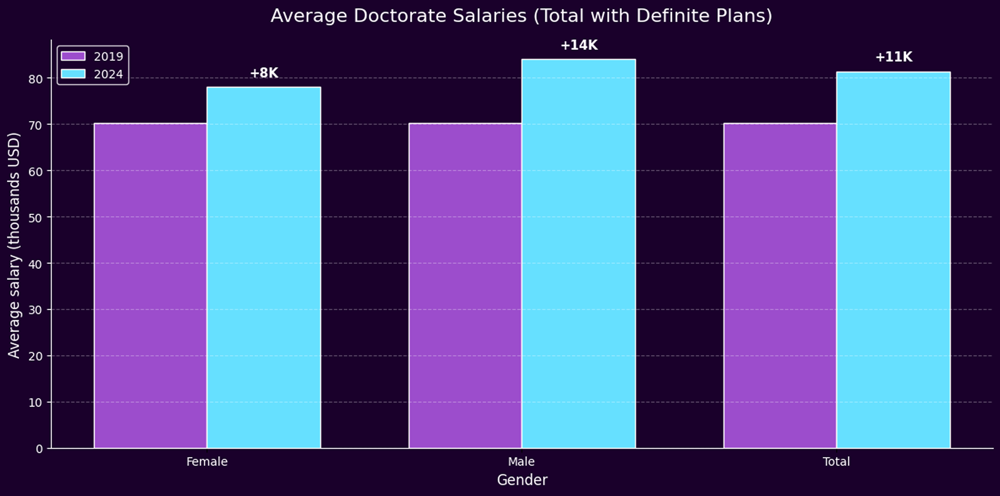 Between 2019 and 2024, the data reveals a steady rise in salaries, but also a widening divide depending on both career path and gender . Among doctorate recipients with definite plans, median pay increased by an average of $11,000 , with women's earnings climbing from about $70,000 to $78,000 , and men's from $70,000 to $84,000 . Despite similar educational achievement, male recipients captured stronger growth — underscoring that gender disparities persist even at the highest academic levels.